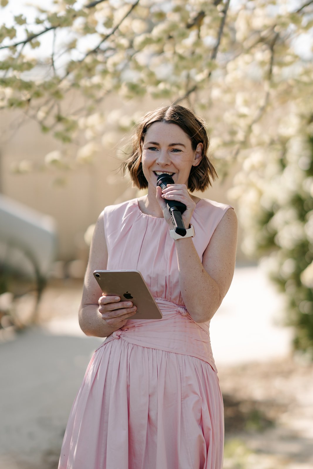 Hiring me as your emcee means I’m your timeline fairy, on-the-night coordinator and the person who improves your experience at your wedding. I’ll keep both your glasses full, make sure no one’s lipstick is smudged (or that anyone has spinach in their teeth), and work with your vendors so everything flows like a dream. I’ll let both of you know when it’s your moment to shine and ensure your family isn’t running off-script.